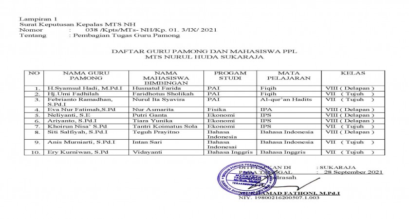 NOMOR : 038 /Kpts/MTs- NH/Kp. 01. 3/IX/ 2021